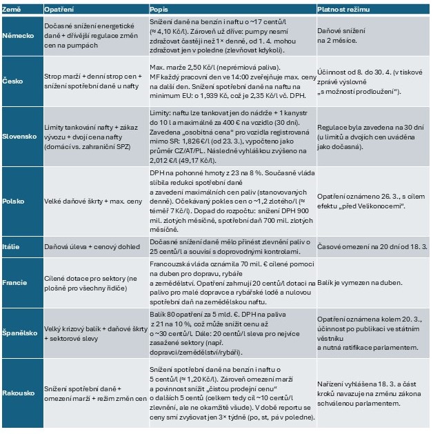 - Česká republika zvolila kombinaci fiskálních a regulačních kroků. Vláda se na začátku dubna rozhodla snížit spotřební daň u nafty o 2,35 Kč na litr včetně DPH, aby ulevila především dopravě a zemědělství. Současně zavedla zastropování obchodních marží na úrovni 2,50 Kč na litr pro všechna běžná paliva s výjimkou prémiových. Ministerstvo financí navíc každý den odpoledne vyhlašuje maximální ceny pro benzín a naftu na následující den. Tato mimořádná opatření mají zatím platnost do konce dubna.